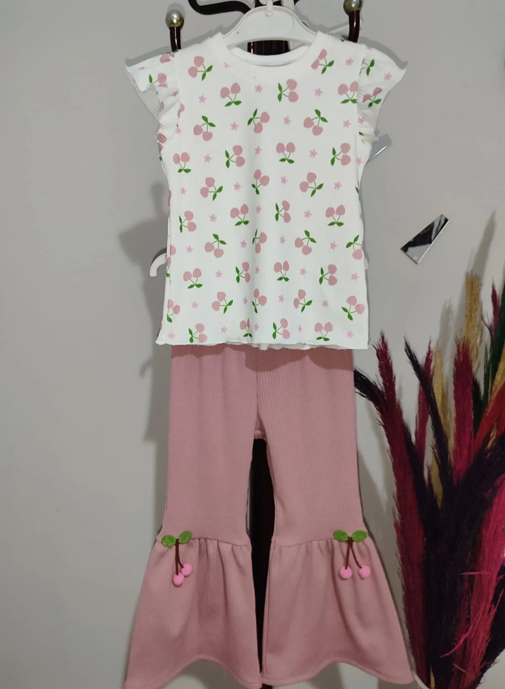 1-2-3-4 Yaş Kiraz Baskılı Tişört İspanyol Paçalı Likralı 2li Kız Çocuk Takımı