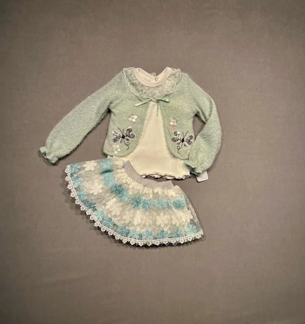 1-2-3 Yaş Brode Etekli Örme Hırkalı Uzun Kollu Sweat 3lü Kız Çocuk Takımı Su Yeşili