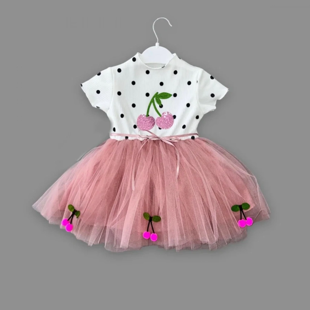 1-2-3 Yaş Payetli Kiraz Nakışlı Kiraz Etekli Kız Bebek Tütü Elbisesi Gül Kurusu