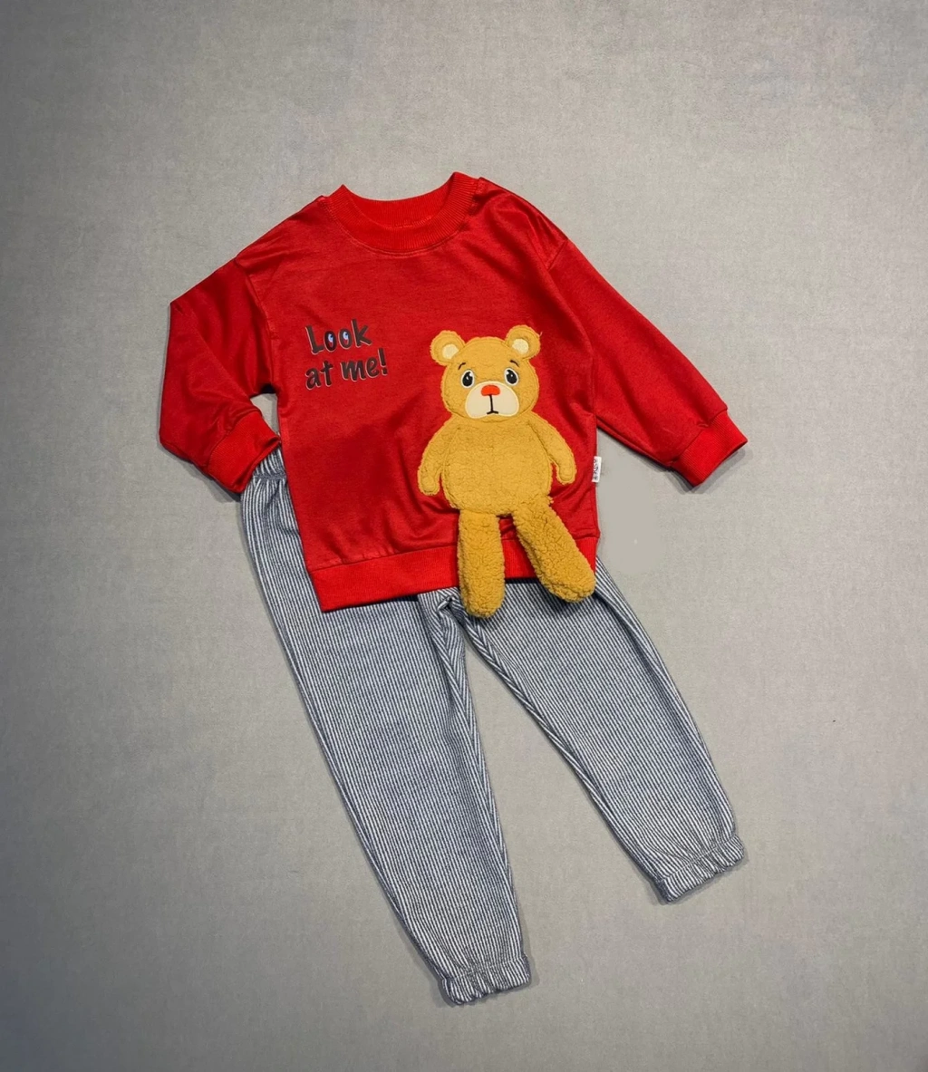 2-3-4 Yaş Ayıcık Sallanan Ayak Desenli Likra Penye Kumaş Sweat Pantolonlu Kız Erkek 2li Çocuk Takımı Kırmızı