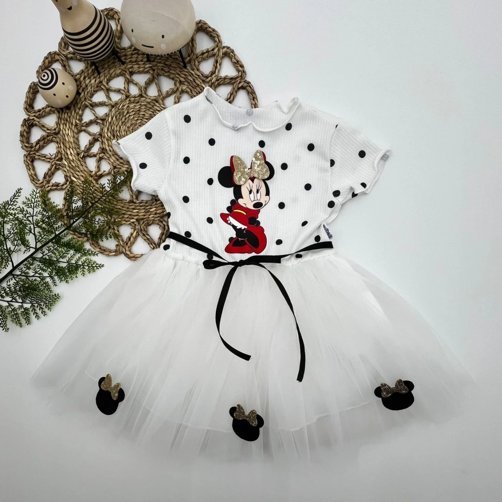 2-3-4 Yaş Puantiyeli Mickey Baskılı Kurdela Kuşaklı Astarlı Kız Bebek Tütü Elbisesi Beyaz