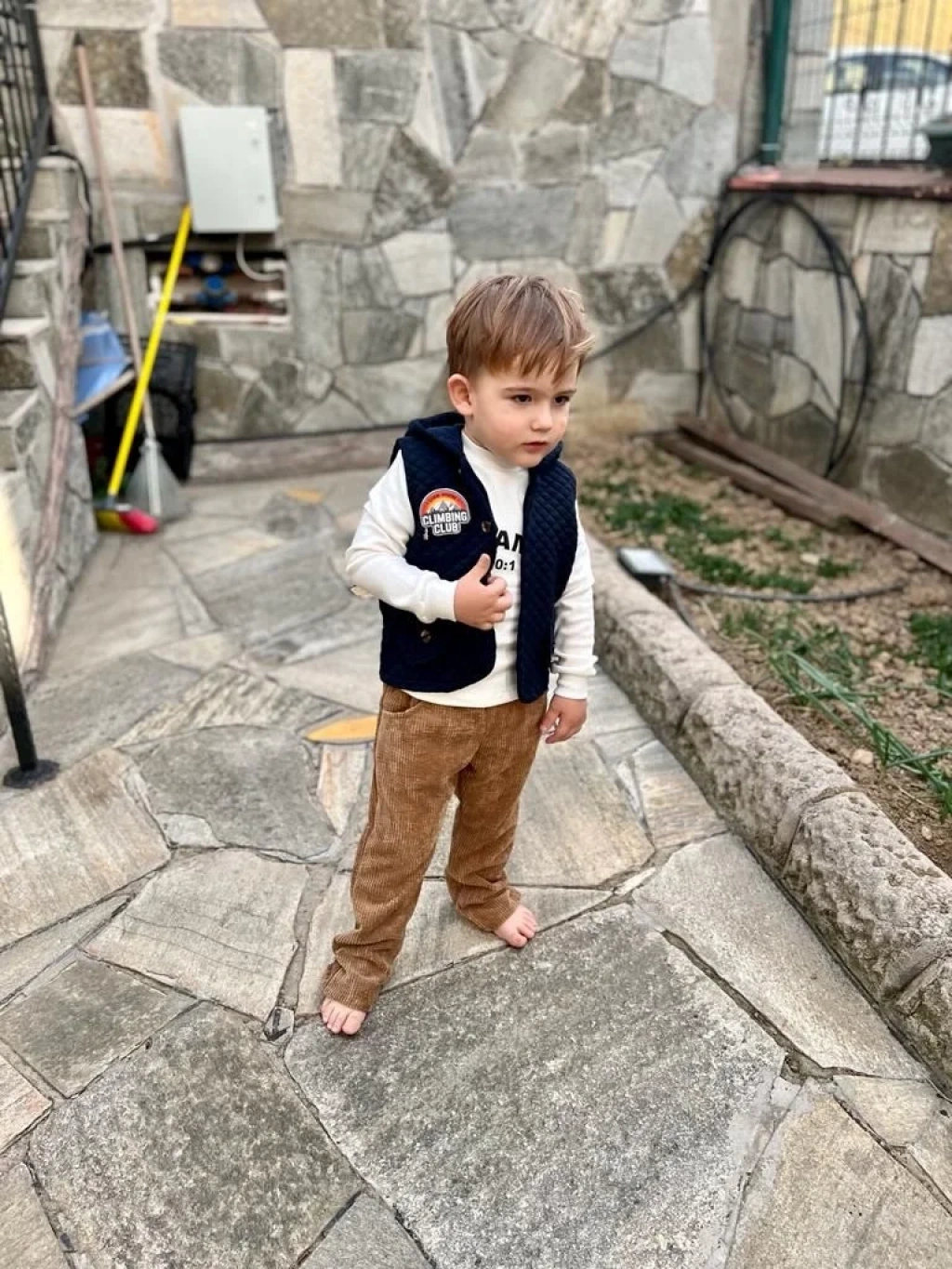 3-4-5 Yaş Fitilli Kadife Pantolon Kapitone Kapşonlu Yelek Uzun Kollu Sweat 3lü Erkek Çocuk Takımı