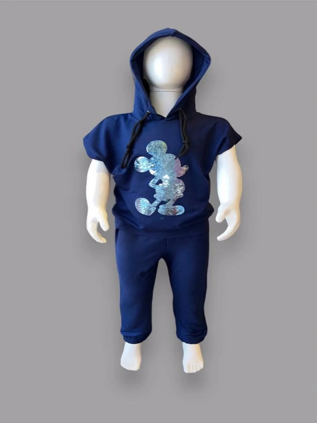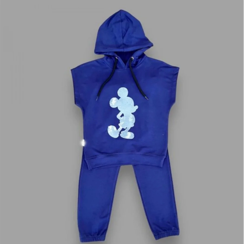 3-4-5 Yaş Kapşonlu Payetli Mickey Desenli Kısa Kol 2li Kız Erkek Çocuk Takımı Lacivert