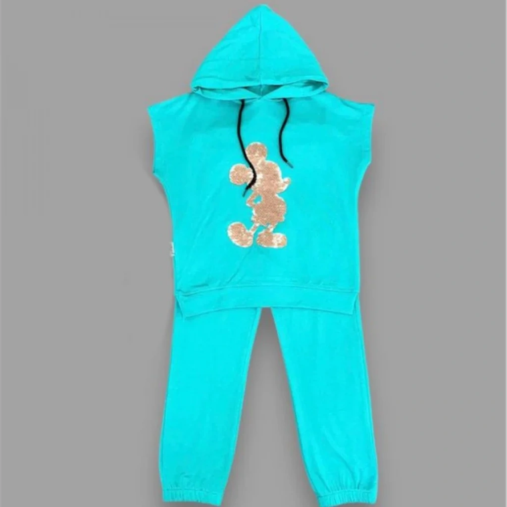 3-4-5 Yaş Kapşonlu Payetli Mickey Desenli Kısa Kol 2li Kız Erkek Çocuk Takımı Turkuaz