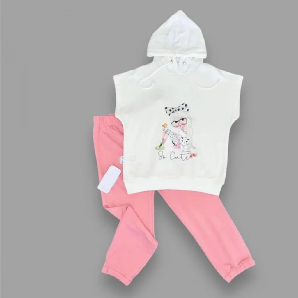 3-4-5 Yaş Kapşonlu Sevimli Kız Baskılı Kısa Kolu 2li Kız Erkek Çocuk Takımı Pembe