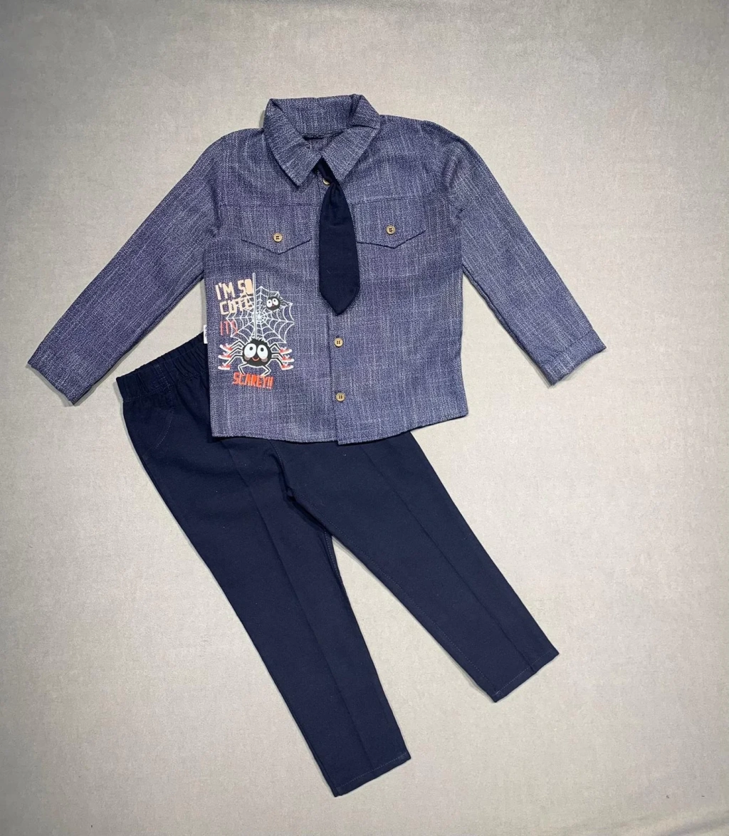3-4-5 Yaş Kravatlı Keten Gömlek Gabardin Pantolon Uzun Kollu 3lü Erkek Çocuk Takımı Lacivert