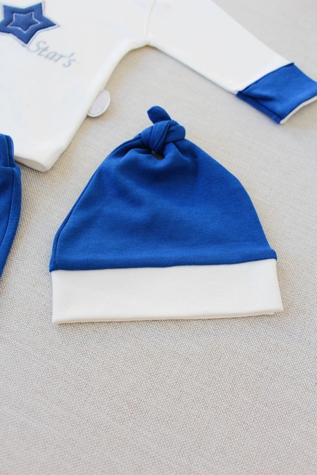 3-6 6-9 9-12 Ay Full Star Nakışlı Şapkalı Uzun Kollu Sweat 3lü Erkek Bebek Takımı İndigo