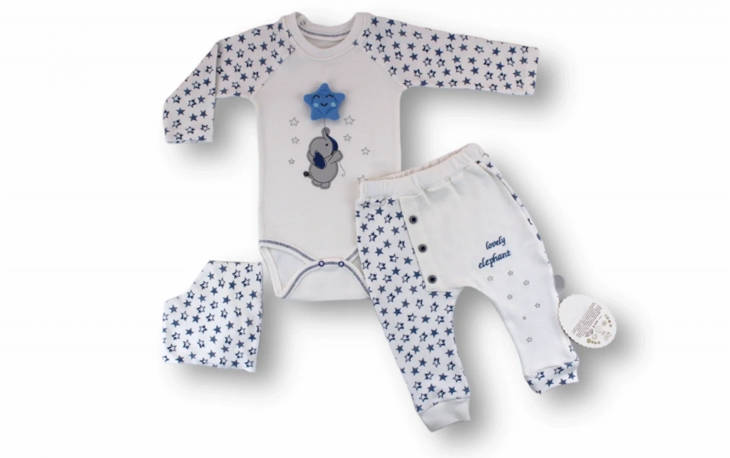 3-6 6-9 9-12 Ay Kutup Yıldızı Nakışlı Bandajlı Uzun Kollu Zıbınlı 3lü Erkek Bebek Takımı