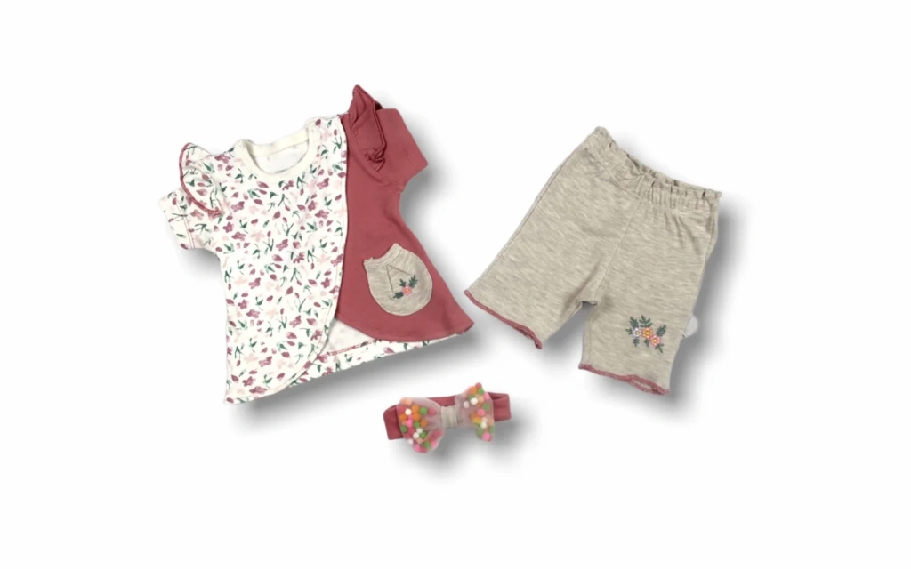 3-6 6-9 9-12 Ay Melek Kız Nakışlı Bandanalı Kısa Kollu Sweatli Şortlu 3lü Kız Bebek Takımı Nar Çiçeği