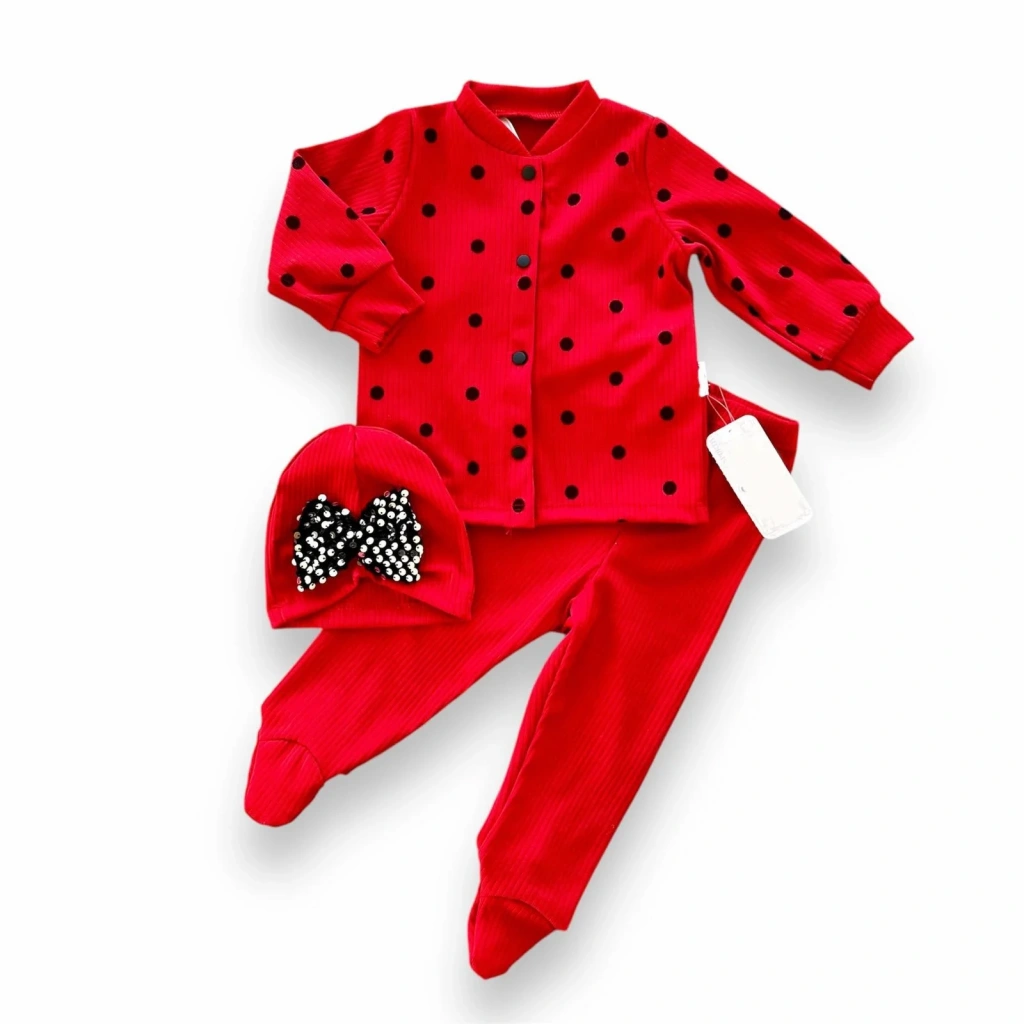 3-6-9-12 Ay Puantiyeli Şapkalı Çıtçıt Kapamalı Patikli 3lü Kız Bebek Takımı Kırmızı