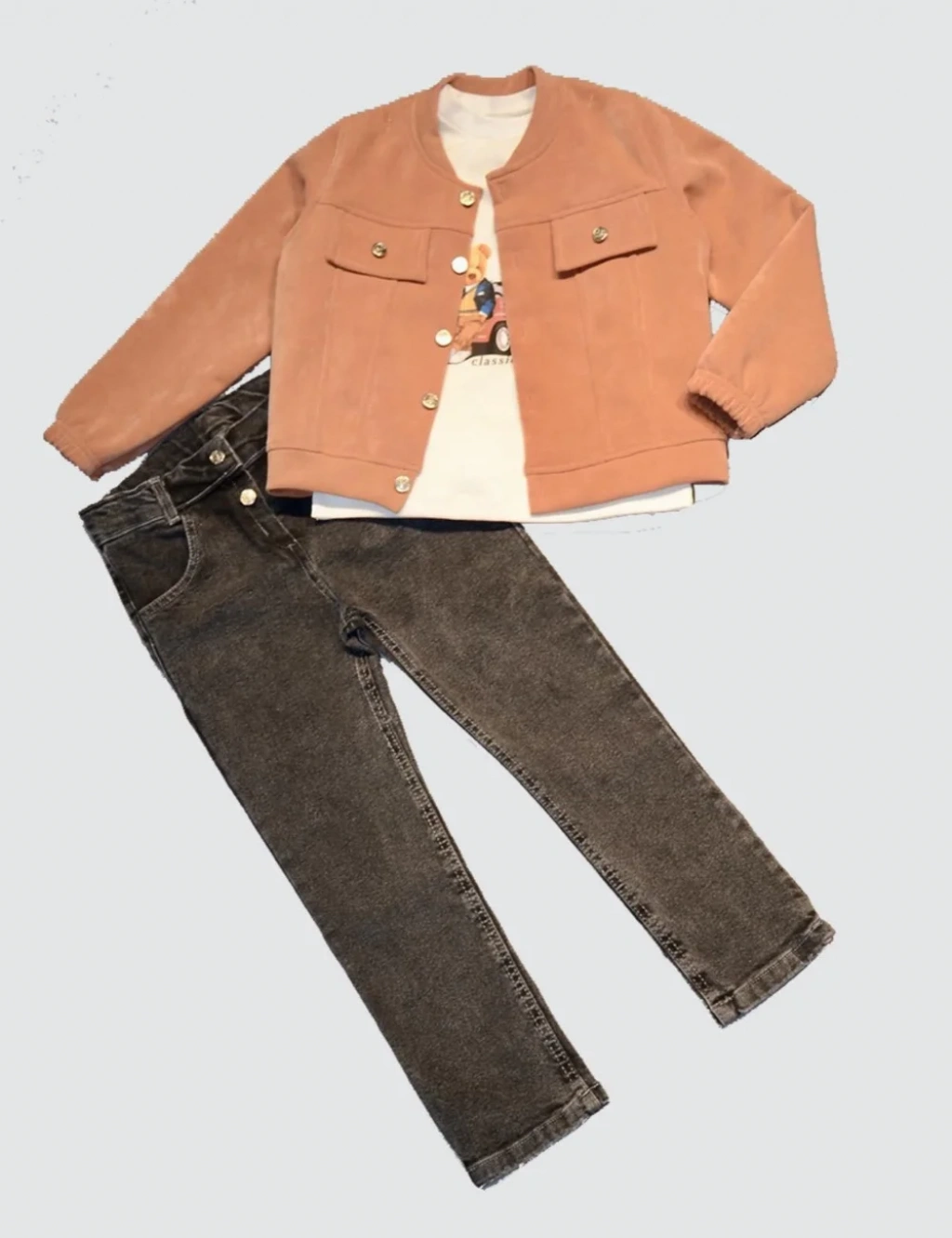 4-5-6 Yaş Kot Pantolonlu Nubukceketli Uzun Kollu Penye Sweat 3lü Erkek Çocuk Takımı