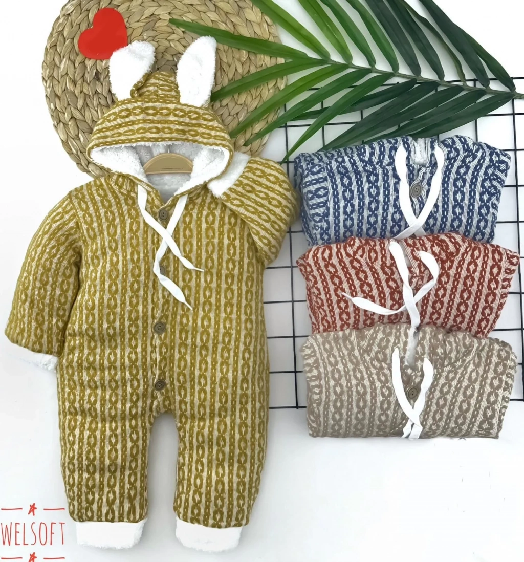 6-9-12-18 Ay Düğme Kapamalı Kulaklı Kapşonlu Triko Kumaş Kız Erkek Bebek Tulumu