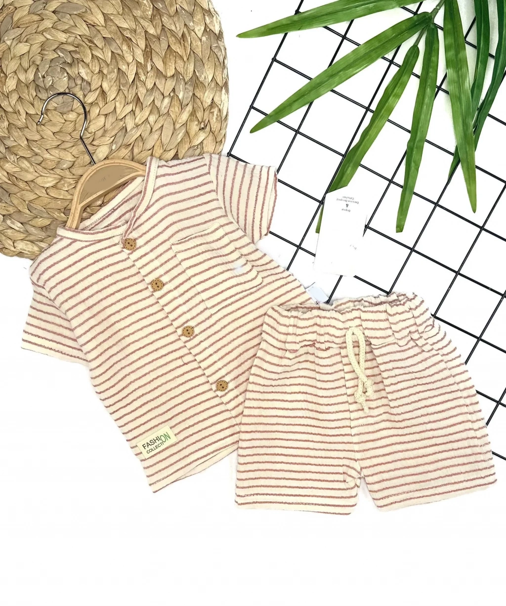 9-12-18-24 Ay Düğme Detaylı Çizgili Müslin Kumaş Yazlık 2li Erkek Bebek Takımı