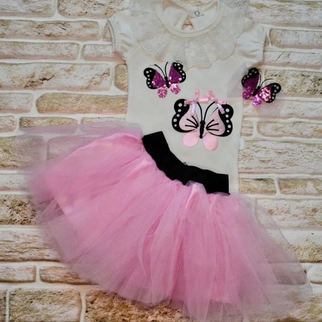 9-12-18 Ay Payetli Kelebek Nakışlı Taçlı Kısa Kollu Tütü Etek 3lü Kız Bebek Takımı Pudra