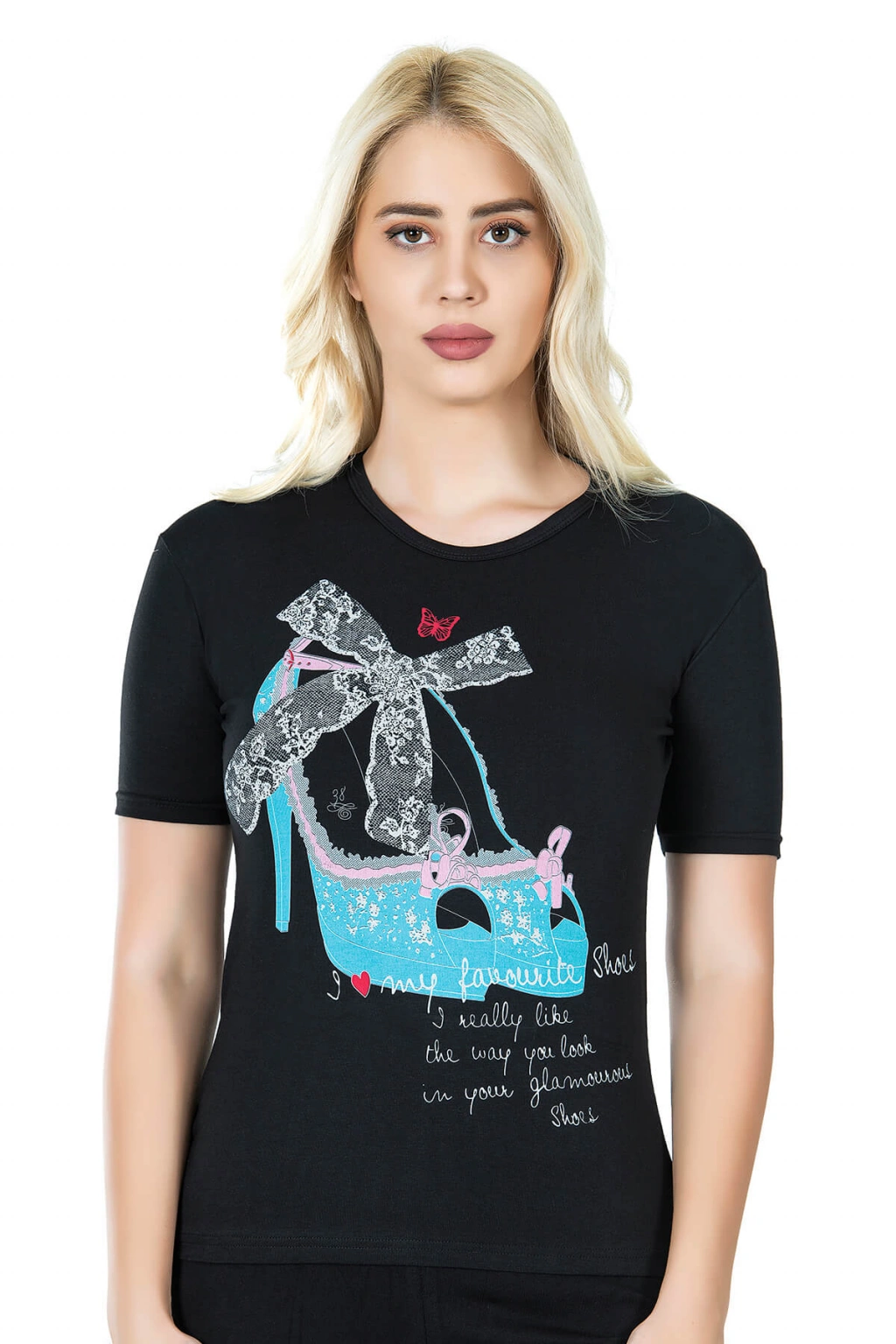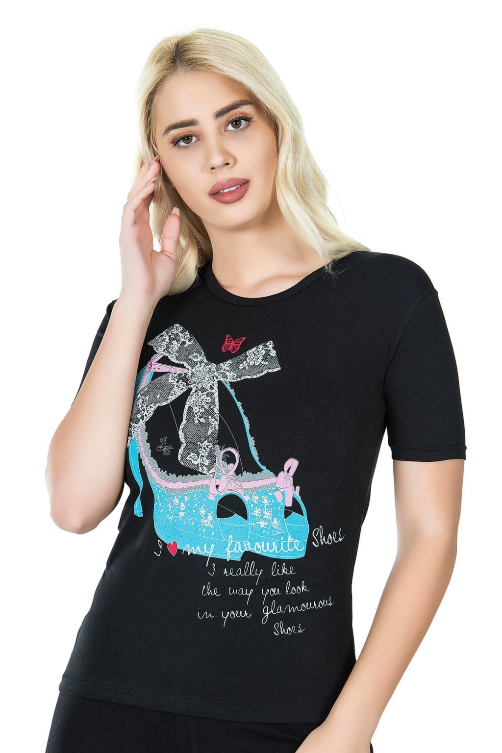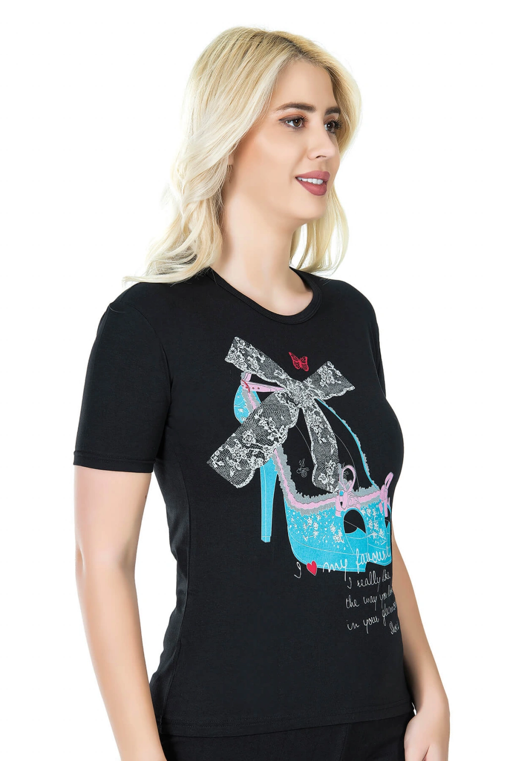 Babet baskılı bisiklet yaka yarım kollu kadın tişört modelidir.
