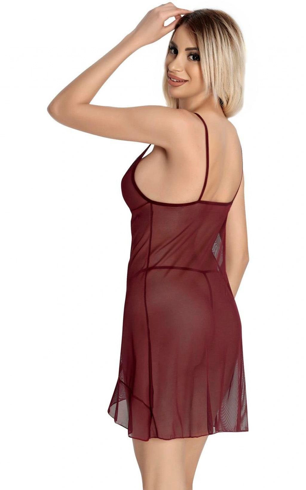 Bordo Dantel İşlemeli Göğğüs İp Detaylı Fantezi Tül Gecelik