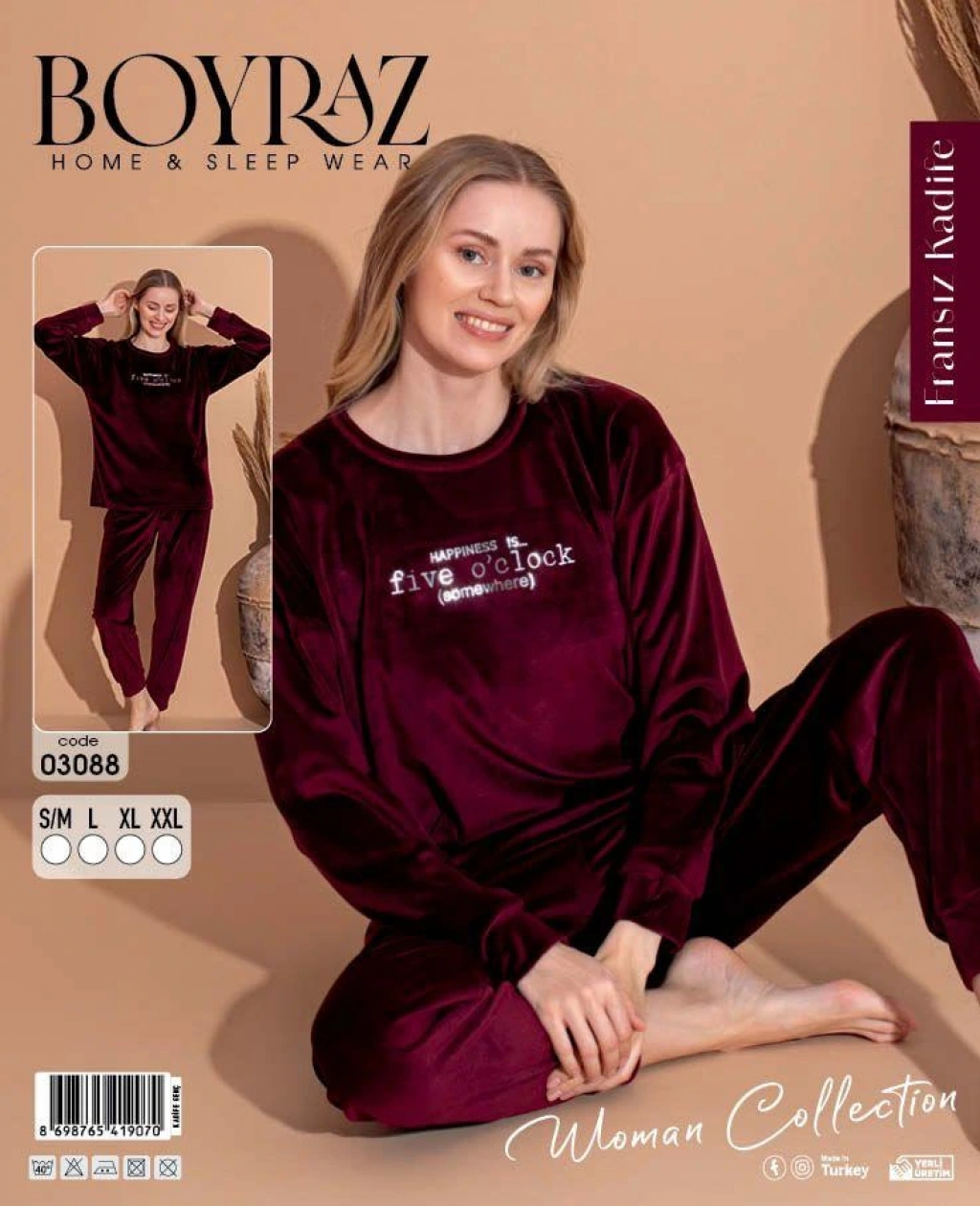 Boyraz 03088 Fransız Kadife Kumaş Uzun Kol Pijama Takımı