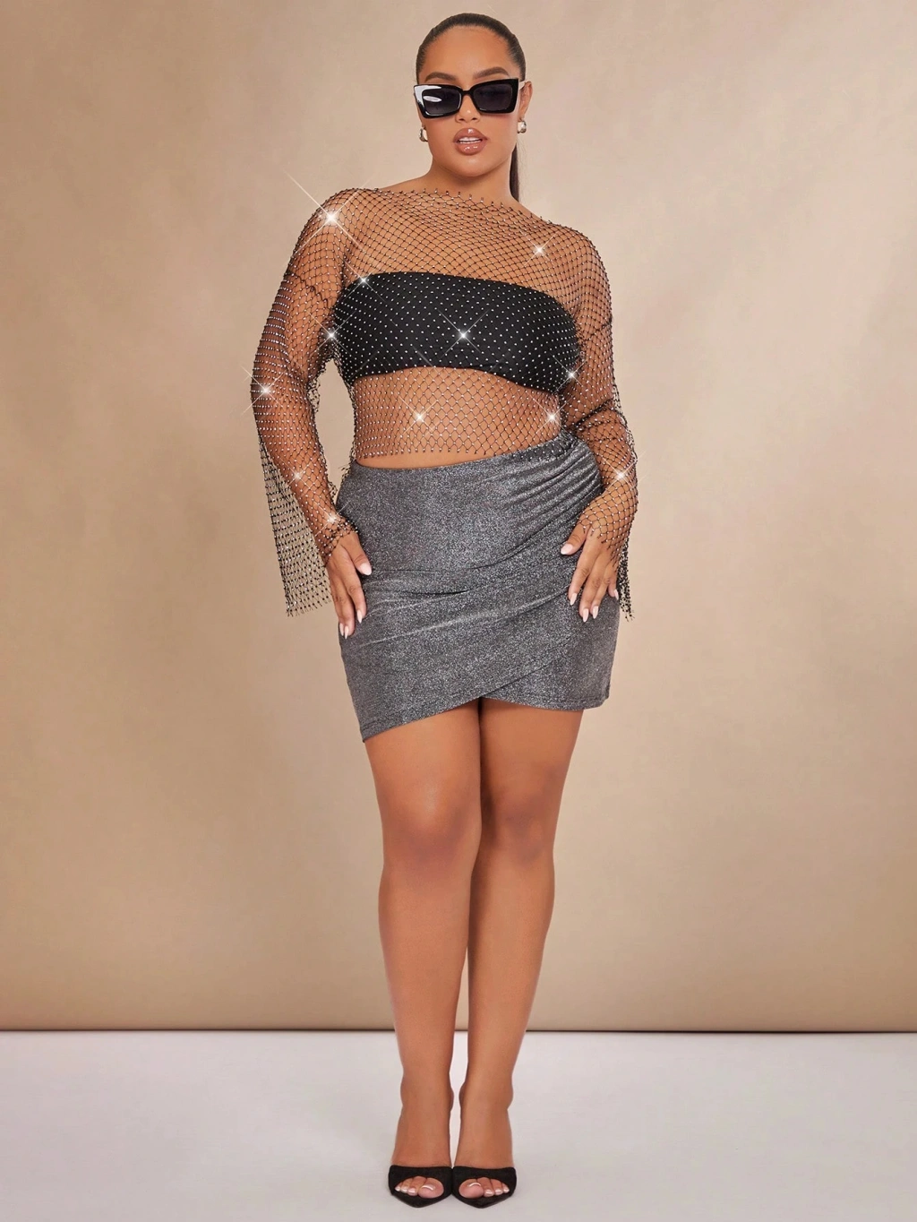 Kadın Siyah Kristal Taşlı File Crop