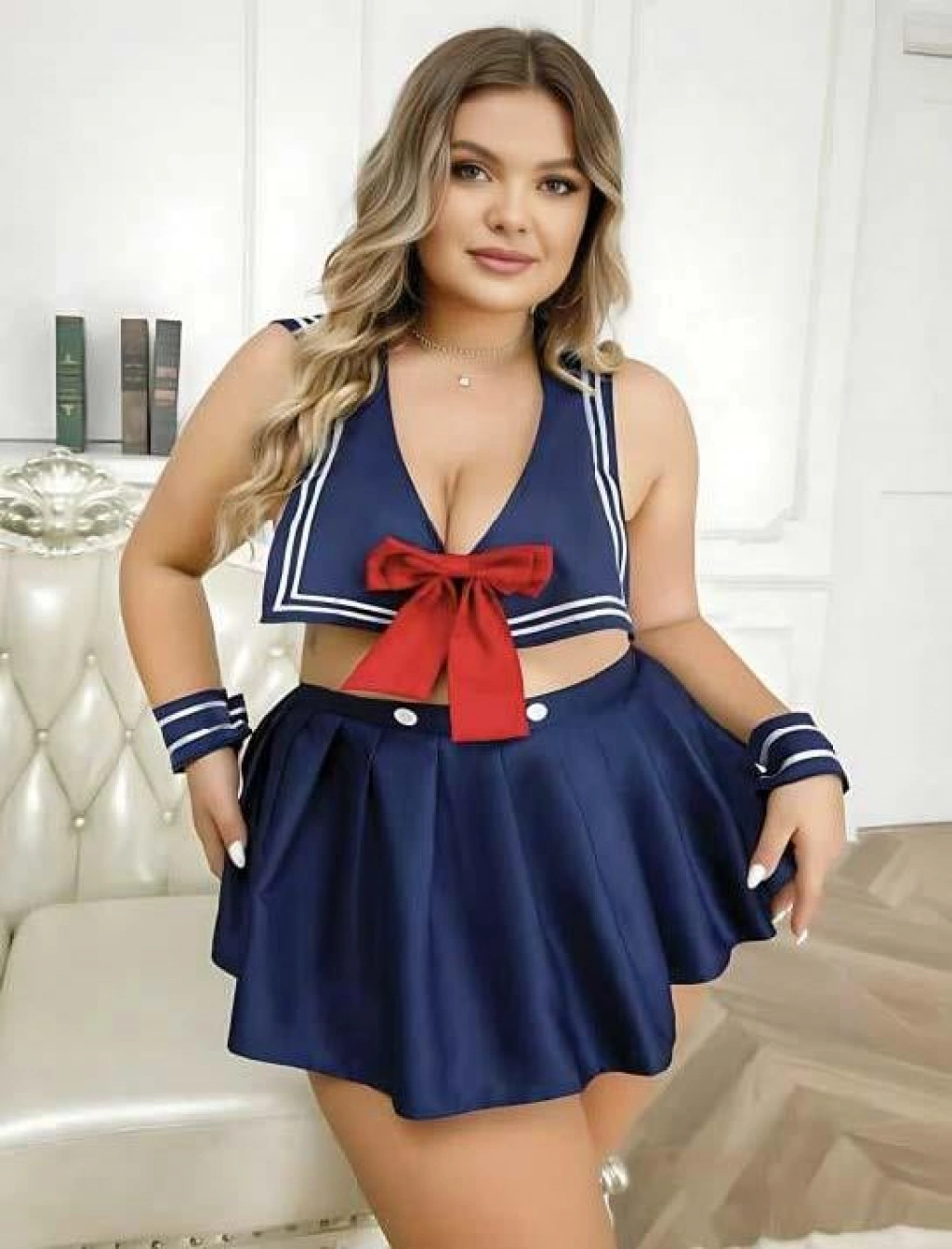 Büyük Beden Lacivert Büstiyerli Kurdela Detaylı Mini Etekli Fantezi Denizci Kostümü