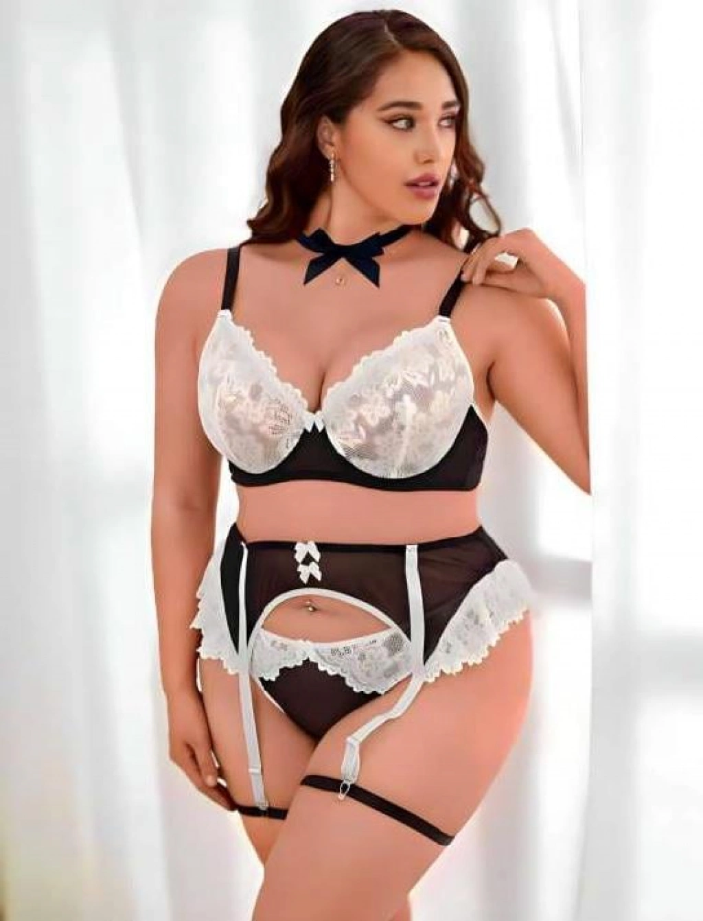 Büyük Beden Siyah Beyaz Dantel İşlemeli Fantezi Jartiyer Takımı