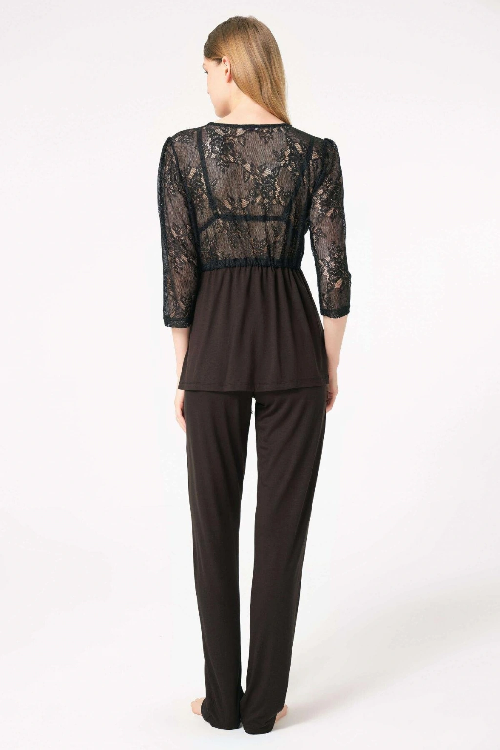 Kısa Ad:Kadın Dantelli Sabahlık Balensiz Desteksiz Dolgusuz Yaka Detaylı Sütyen ve Pantolon Pijama 3'lü Takım (5698)