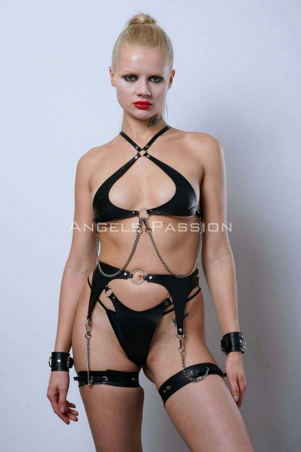 • Deri Jartiyer Takım, Zincir Detaylı Şık Fantezi Takım, Deri İç Giyim - Brf1219