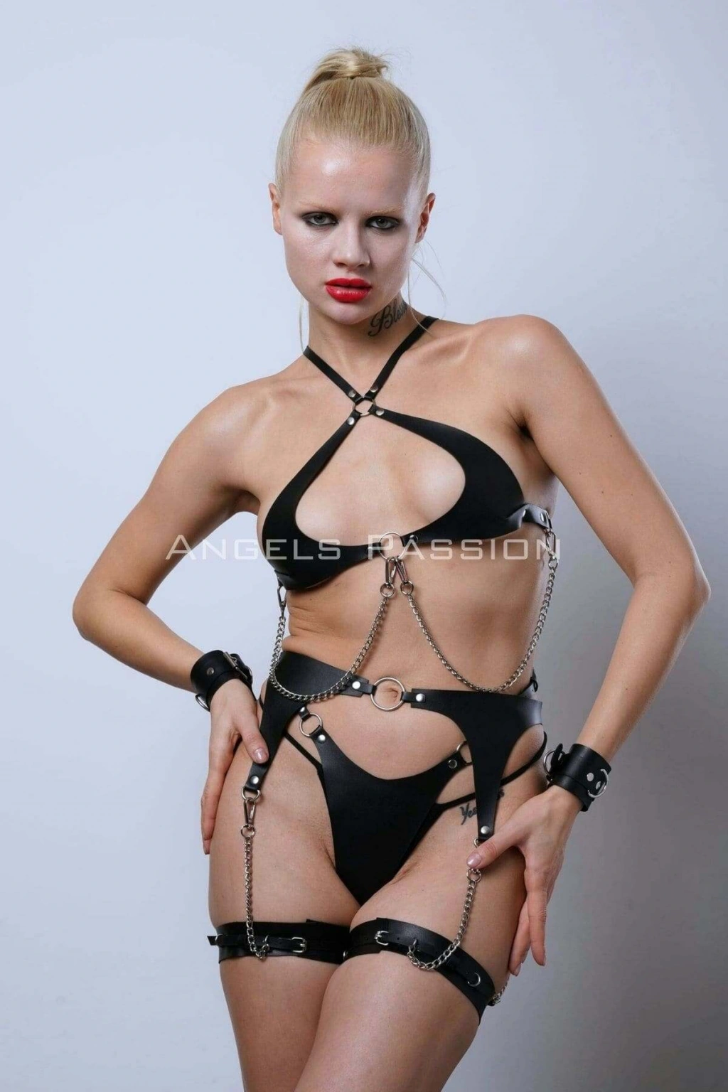 Deri Jartiyer Takım, Zincir Detaylı Şık Fantezi Takım, Deri İç Giyim - Brf1219