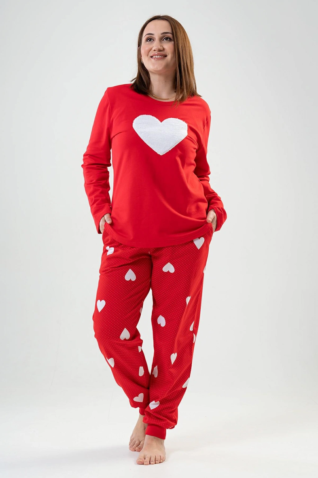 Kadın Mor Kalp Desenli Fiyonklu Kısa Kollu Uzun Pijama Takımı