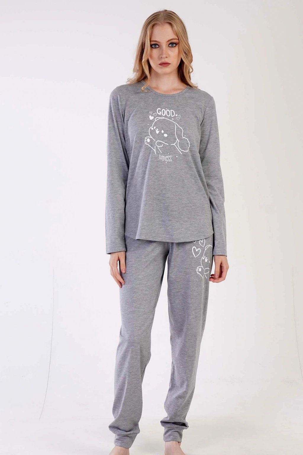 Kadın Mor Kalp Desenli Fiyonklu Kısa Kollu Uzun Pijama Takımı