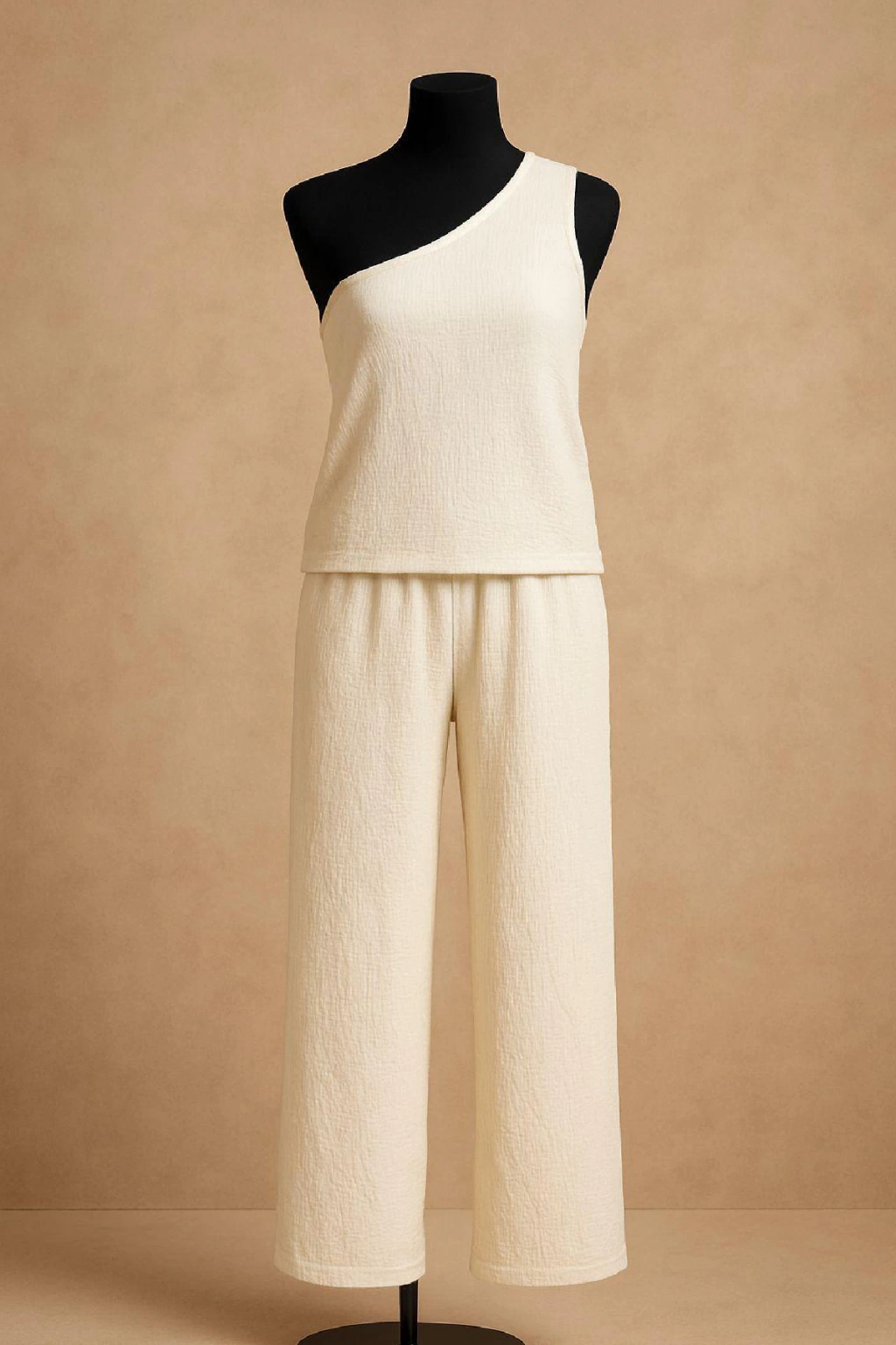 Kadın beyaz tek omuzlu bluz ve geniş paça pantolon ikili takım, zarif ve modern tarzı ile hem şık davetlerde hem de günlük kombinlerde rahatlıkla tercih edilebilecek özel bir parçadır. Saf beyaz rengin asaletiyle tasarlanan bu takım, minimal ve sofistike görünümüyle dolabınızın en göz alıcı kıyafetlerinden biri olmaya adaydır.Üst parçada bulunan tek omuz detayı, feminen bir duruş sergilerken, alt parçadaki yüksek bel ve geniş paça pantolon rahatlığı ve modern şıklığı ön plana çıkarır. Yaz aylarında serin tutan hafif kumaşı sayesinde konfor sunar, mevsim geçişlerinde ise şık bir ceket veya trençkot ile mükemmel bir kombin oluşturur.İster ofis stilinde, ister özel günlerde, ister tatil akşamlarında kullanabileceğiniz bu ikili takım; topuklu ayakkabı, sandalet veya sneaker ile farklı kombinlere kolayca uyum sağlar.Ürün Özellikleri:Renk: BeyazÜst: Tek omuz detaylı bluzAlt: Yüksek bel, geniş paça pantolonKumaş: Rahat, dökümlü ve hafif dokuluMevsim: 4 mevsim kullanıma uygunKombin: Günlük, ofis, davet, akşam yemeği, tatil ve özel günNeden Tercih Etmelisiniz?Asaletin simgesi olan beyaz renkİki parça ayrı ayrı kullanılarak farklı kombinler oluşturma imkânıModern, zarif ve şık tasarımGün boyu konfor sağlayan rahat kalıpBu beyaz ikili takım ile hem sade hem de göz alıcı bir stil yakalayın, bulunduğunuz her ortamda şıklığınızla fark yaratın.]]>