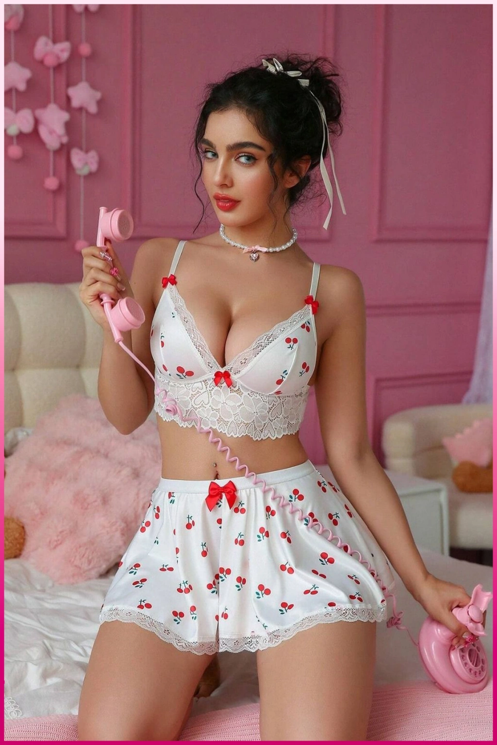 Kadın Kirazlı Fiyonklu Seksi Kostüm