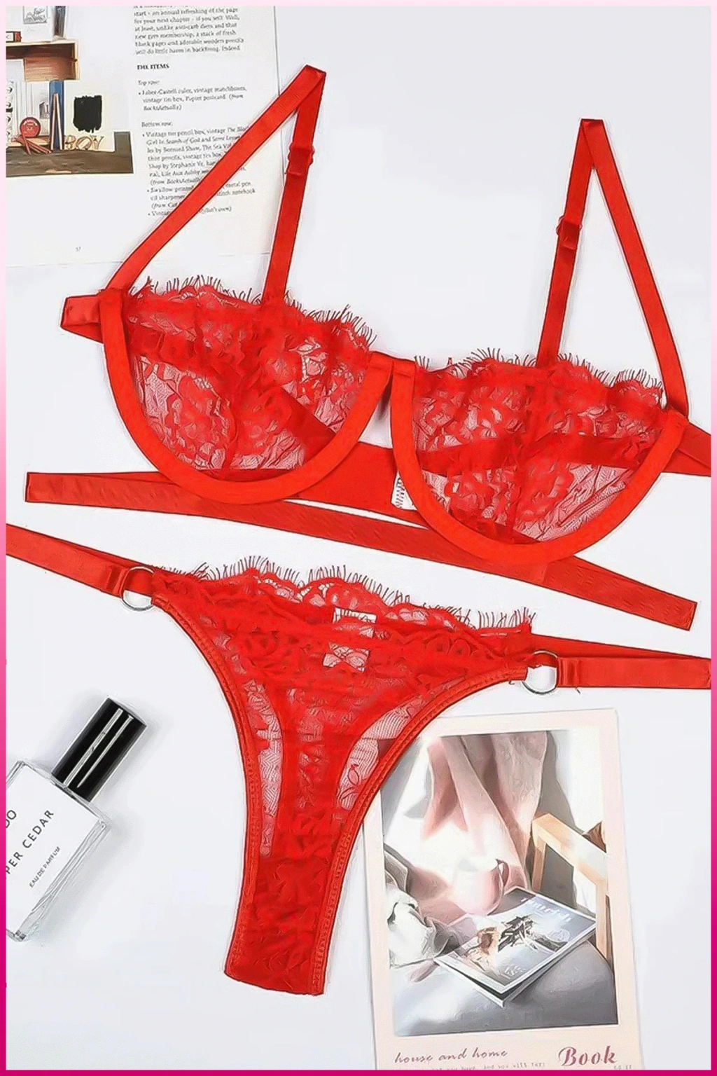 • Kadın Kırmızı Dantelli Balenli Sütyen Külot Takım