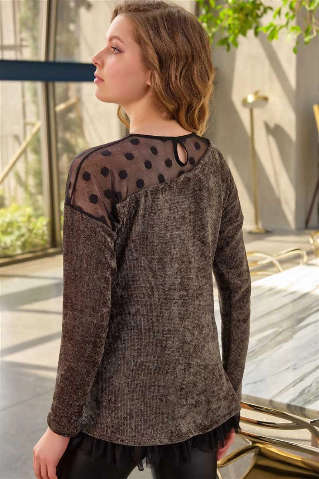 Kısa Ad:Kadın Puantiyeli Tüllü Uzun Kollu Sweatshirt ve Deri Görünümlü Tayt Takım (9739)