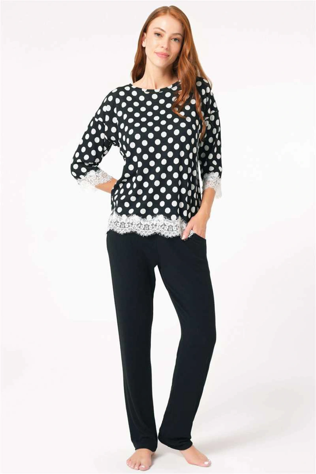 Kısa Ad:Kadın Viskon Puantiyeli Uzun Kol Dantelli Sweatshirt ve Pantolon Pijama Takım (9760)