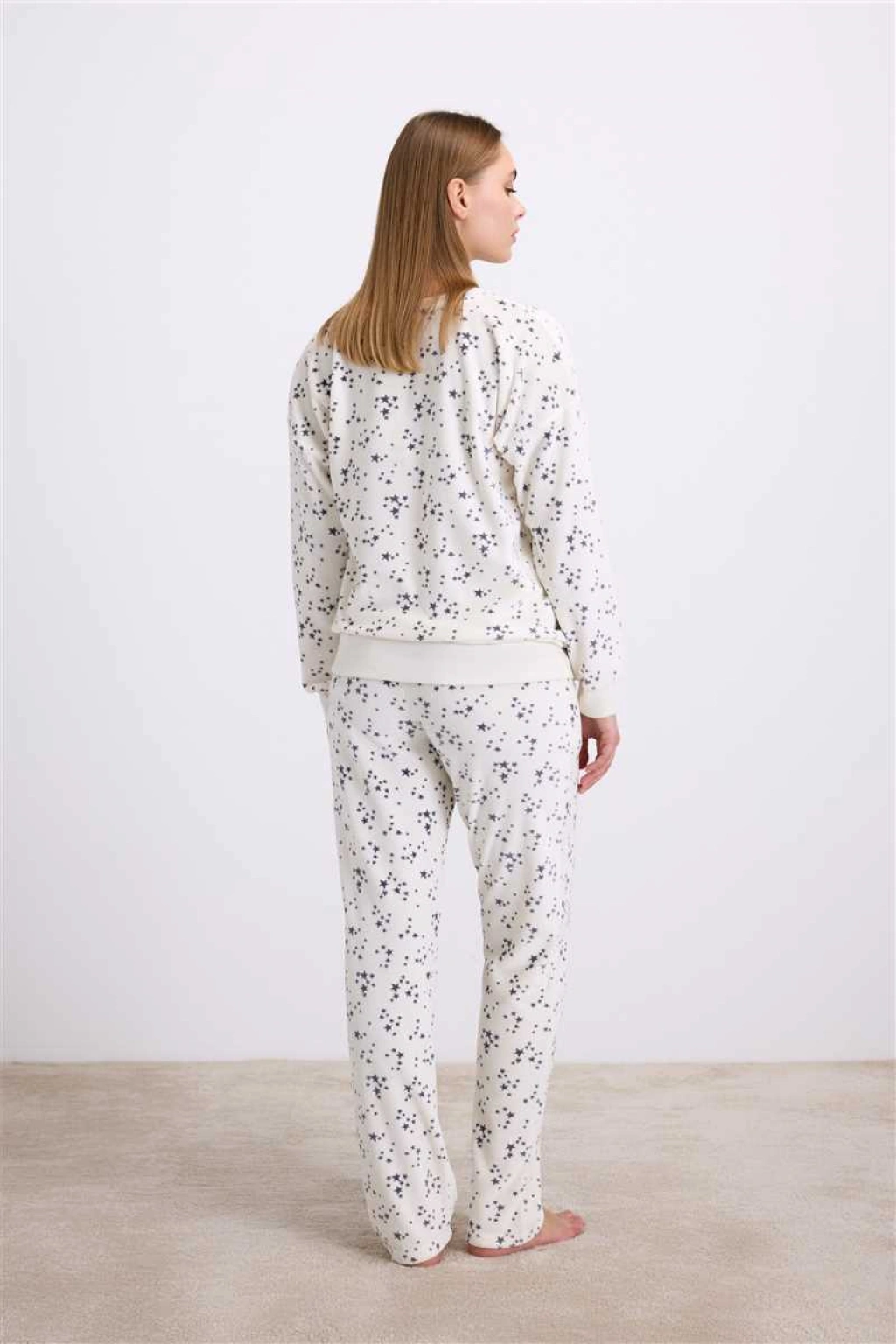 Parlayan detaylarıyla zarafeti konforla buluşturan 11592 takımı, “I love to sparkle” sloganı ve yıldız desenleriyle gecelerinize sıcaklık, tarzınıza ışıltı katıyor. Doğal liflerle zenginleştirilmiş Tencel™ kumaşın yumuşak dokusu sayesinde cildiniz nefes alır, siz ise gün boyu rahatlığın keyfini yaşarsınız.Üst parça, sade ama etkileyici bir duruş sunan klasik sweatshirt formundadır. Yuvarlak yakası ve bilek şetleriyle konforlu bir kullanım sağlar. Göğüs kısmındaki ışıltılı yazı detayı, minimal bir şıklık sunarken içeriğindeki simli dokunuşlar feminen bir zarafet kazandırır.Alt parça, rahat kesim pantolon formu ve esnek bel bandı ile konforu tamamlar. Yumuşak kumaş dokusu, tenle temas ettiğinde huzur verici bir sıcaklık hissi yaratır. Kumaşın özel karışımı (%40 Tencel™, %40 pamuk, %20 polyester), hem dayanıklılık hem de doğal esneklik sunarak uzun ömürlü kullanım sağlar.Kış aylarında sıcak tutan, bahar akşamlarında ise hafif dokusuyla rahatlık sağlayan bu takım, “rahatlık ve zarafet bir arada” diyen kadınlar için tasarlandı.Detaylar:Ürün kodu: 11592Renk: Ekru zemin üzerine lacivert yıldız deseniKumaş içeriği: %40 Tencel™, %40 Pamuk, %20 PolyesterYuvarlak yaka, uzun kollu sweatshirt üstEsnek bel bantlı düz kesim pantolonIşıltılı “I Love to Sparkle” yazı detayıNefes alabilen, cilt dostu kumaşYumuşacık, sıcak tutan ve hafif yapı