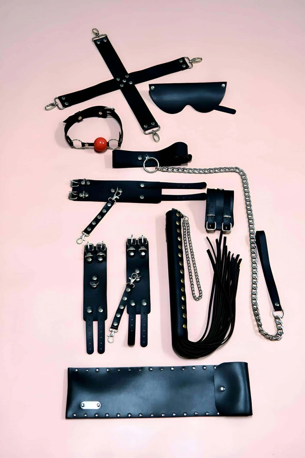 • Ürün ve paket içeriği: 7 parça (Kırbaç ve kırbaç kılıfı, el kelepçe takım, ayak kelepçe takım, tasma, ağız topu, maske ve X bağlama aparatı)
