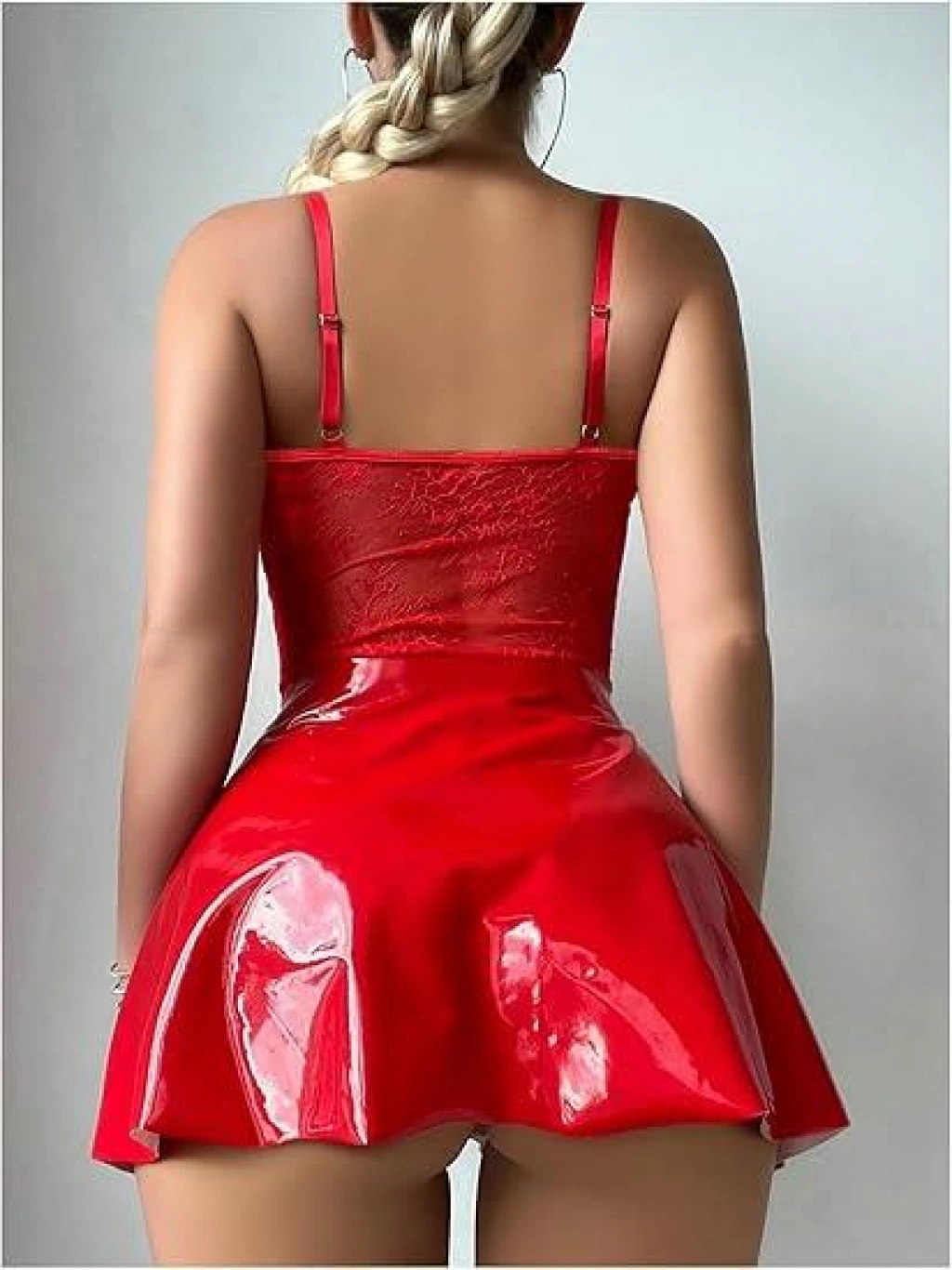 Kırmızı Parlak Deri Şık Bacak Bantlı Fantezi Club Elbise