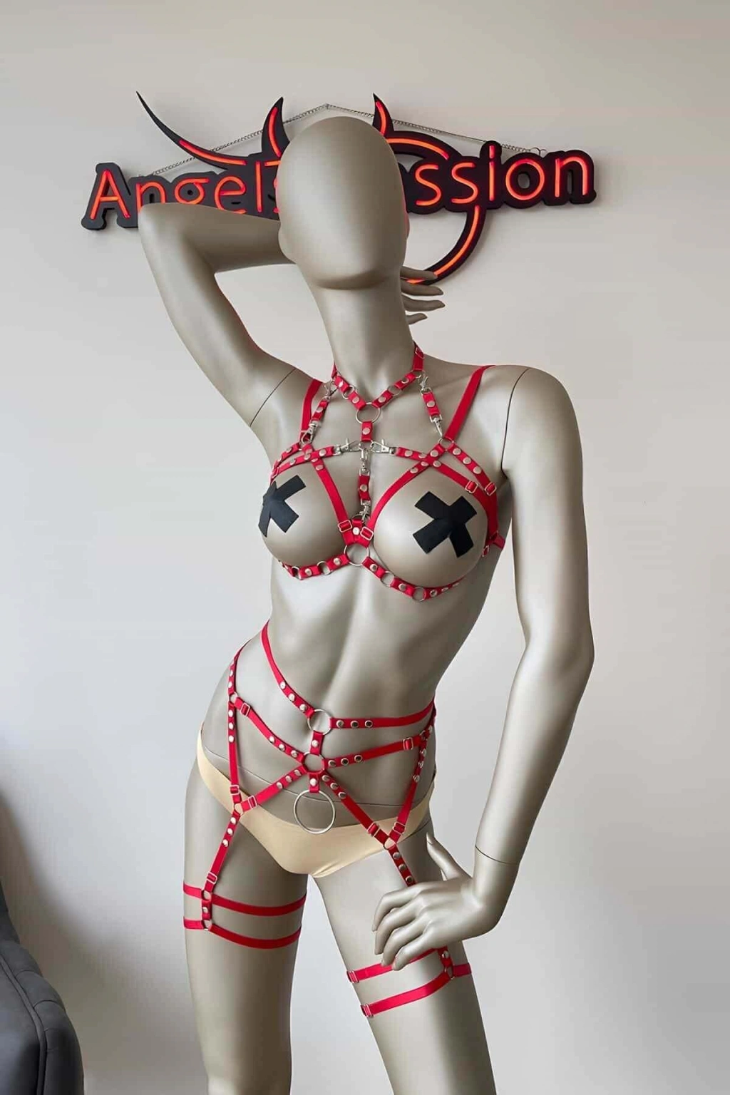 • Kırmızı Seksi Elastik Jartiyer Harness Takım