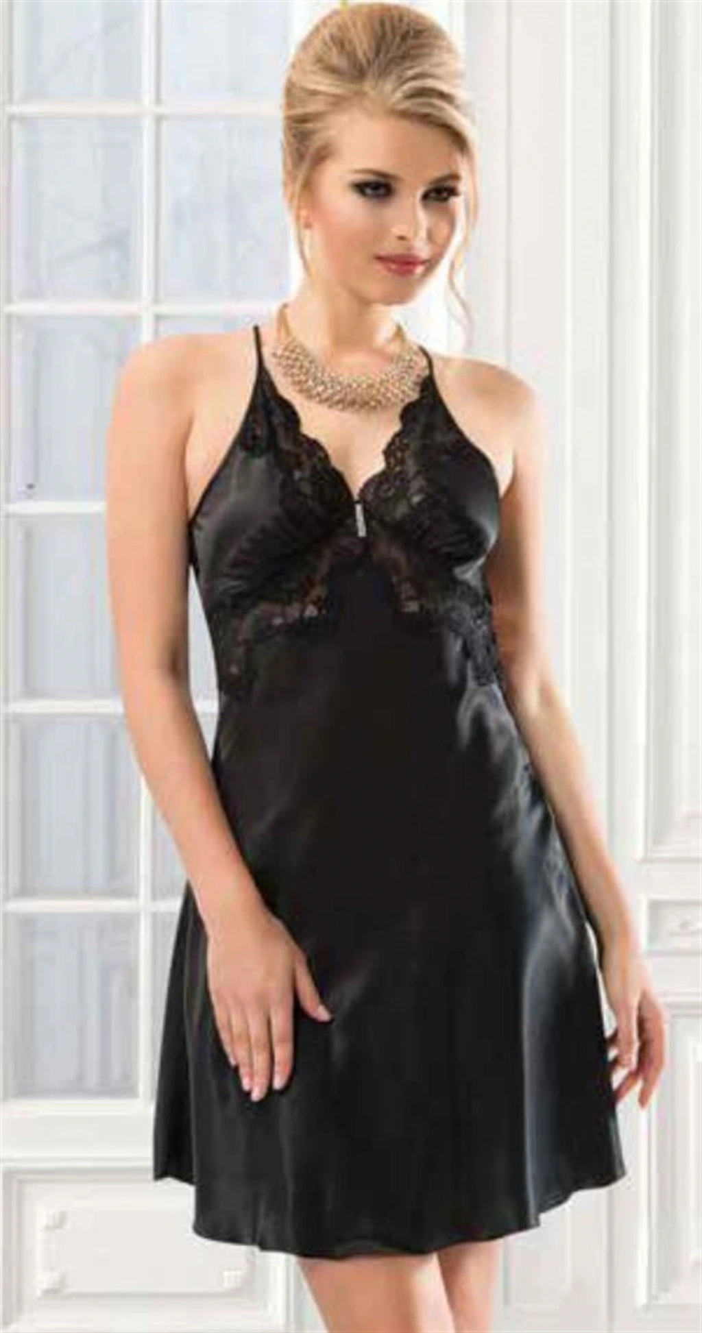 Özel Tasarım Dantel İşlemeli Şık Göğüs Dekolteli Sabahlıklı 2'li Siyah Saten Gecelik Takımı