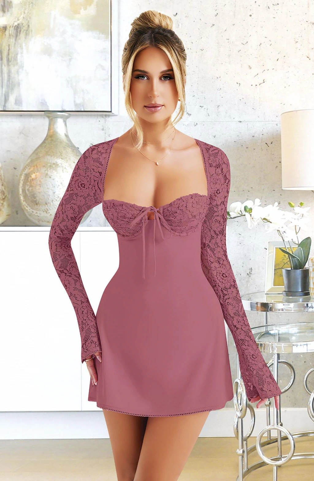 Özel Tasarım Dantel İşlemeli Şık Uzun Bolerolu Fuşya Fantezi Mini Club Elbisesi