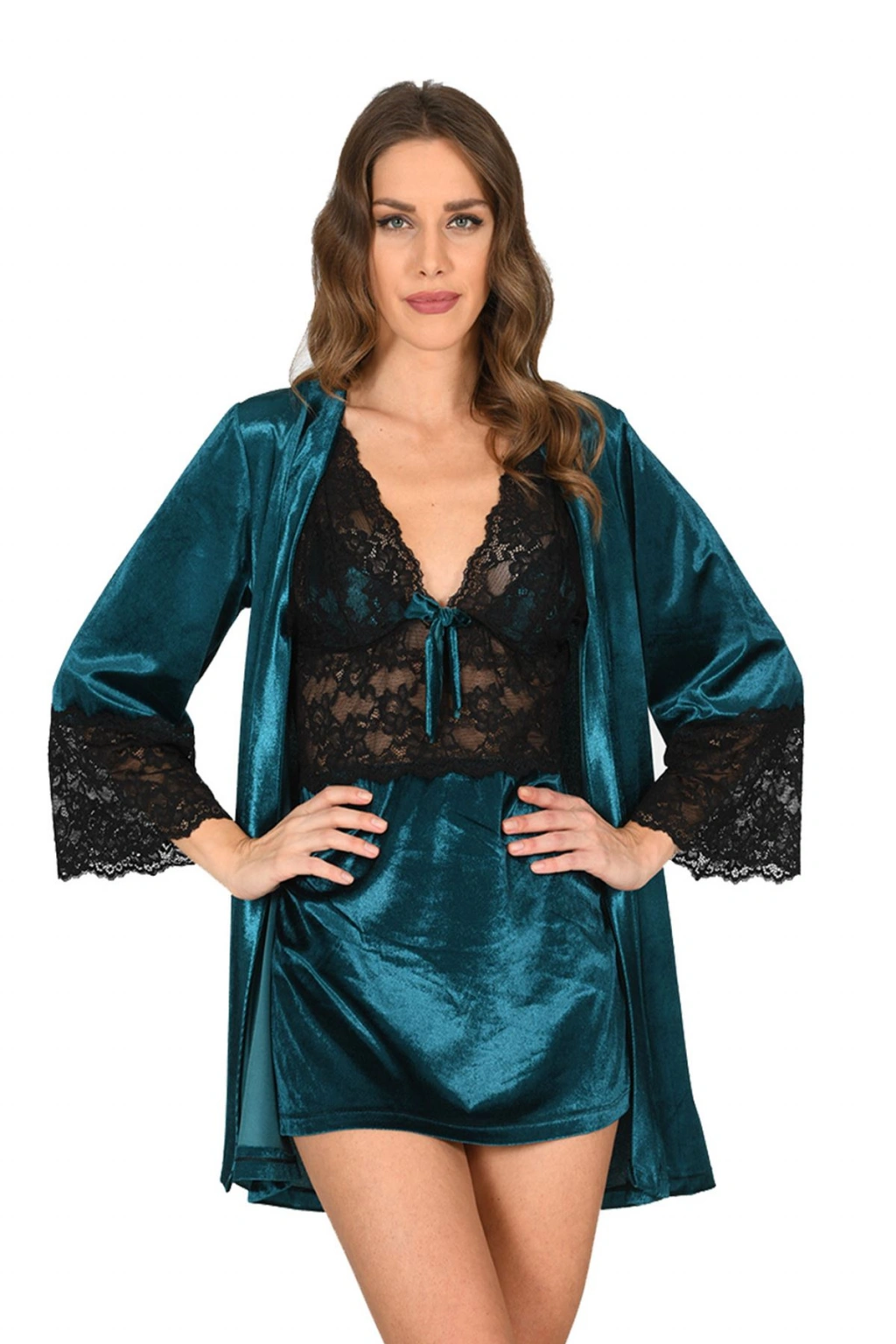 1443 Kadife Petrol Yeşili Sabahlık Takım Üstün Kalitede Kumaşlardan üretilmiştir. Özel Paketinde Gönderilmektedir. Kumaş türü : %80 Kadife %20 Dantel Ürün içeriğ i : Gecelik + Sabahlık S/M - (36-38) L - (40) XL - (42) Bedenlere olmaktadır.