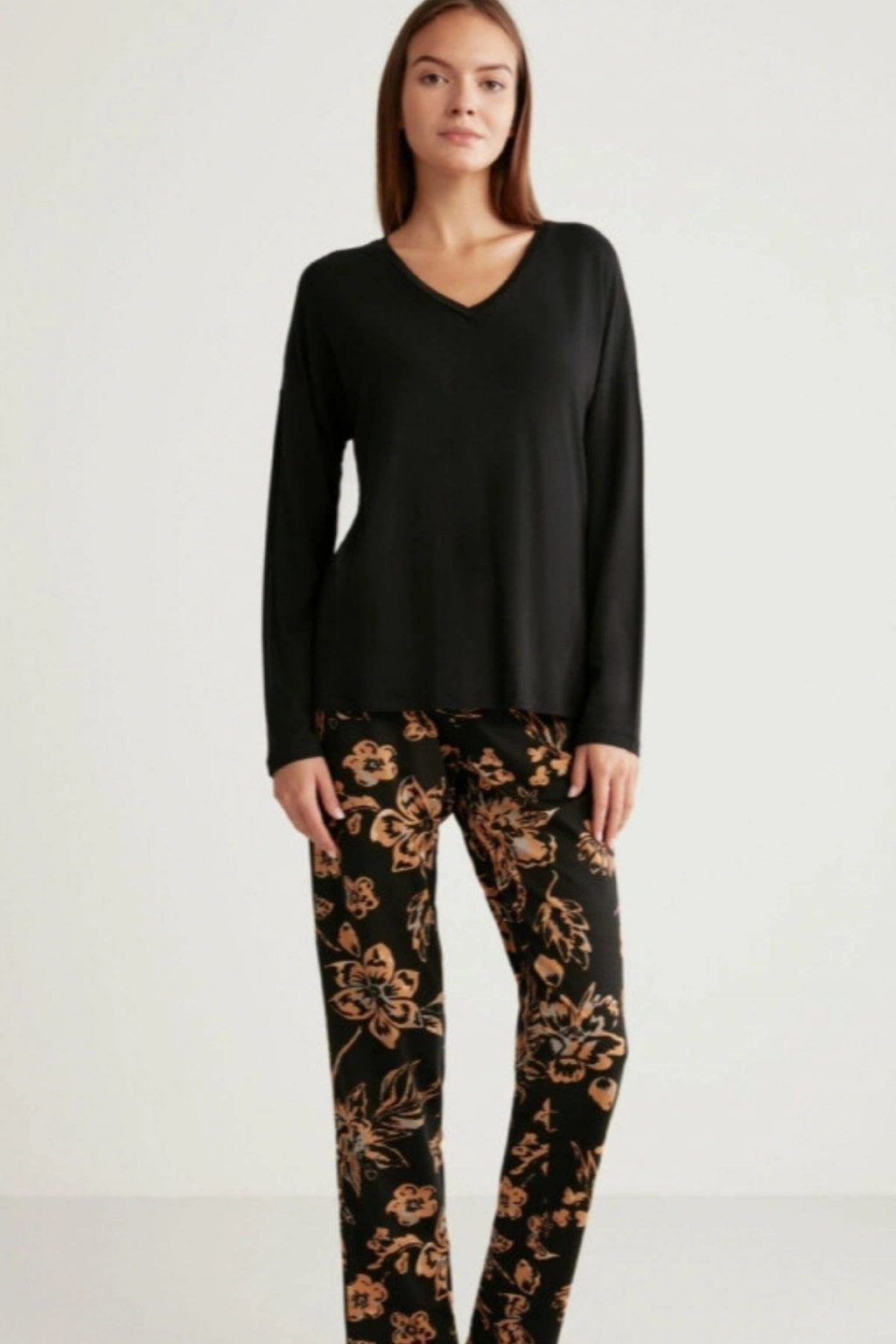Kadın Siyah Uzun Kollu Fiyonklu Yuvarlak Yaka Mevsimlik Pijama Takımı