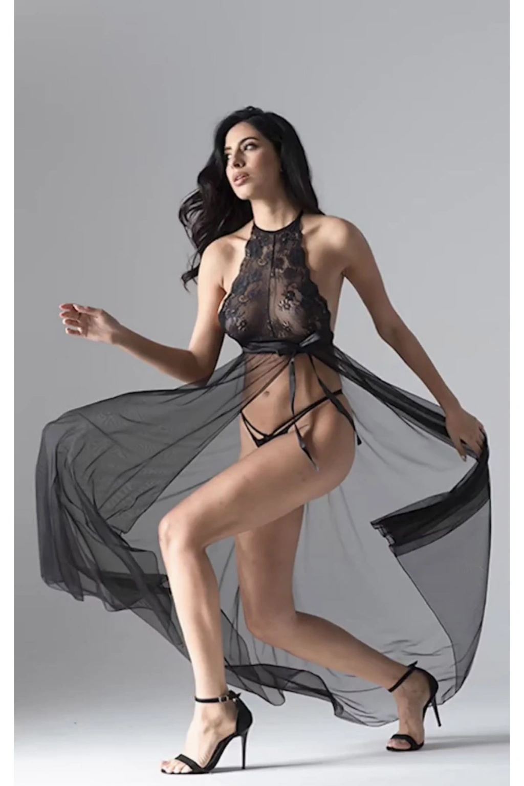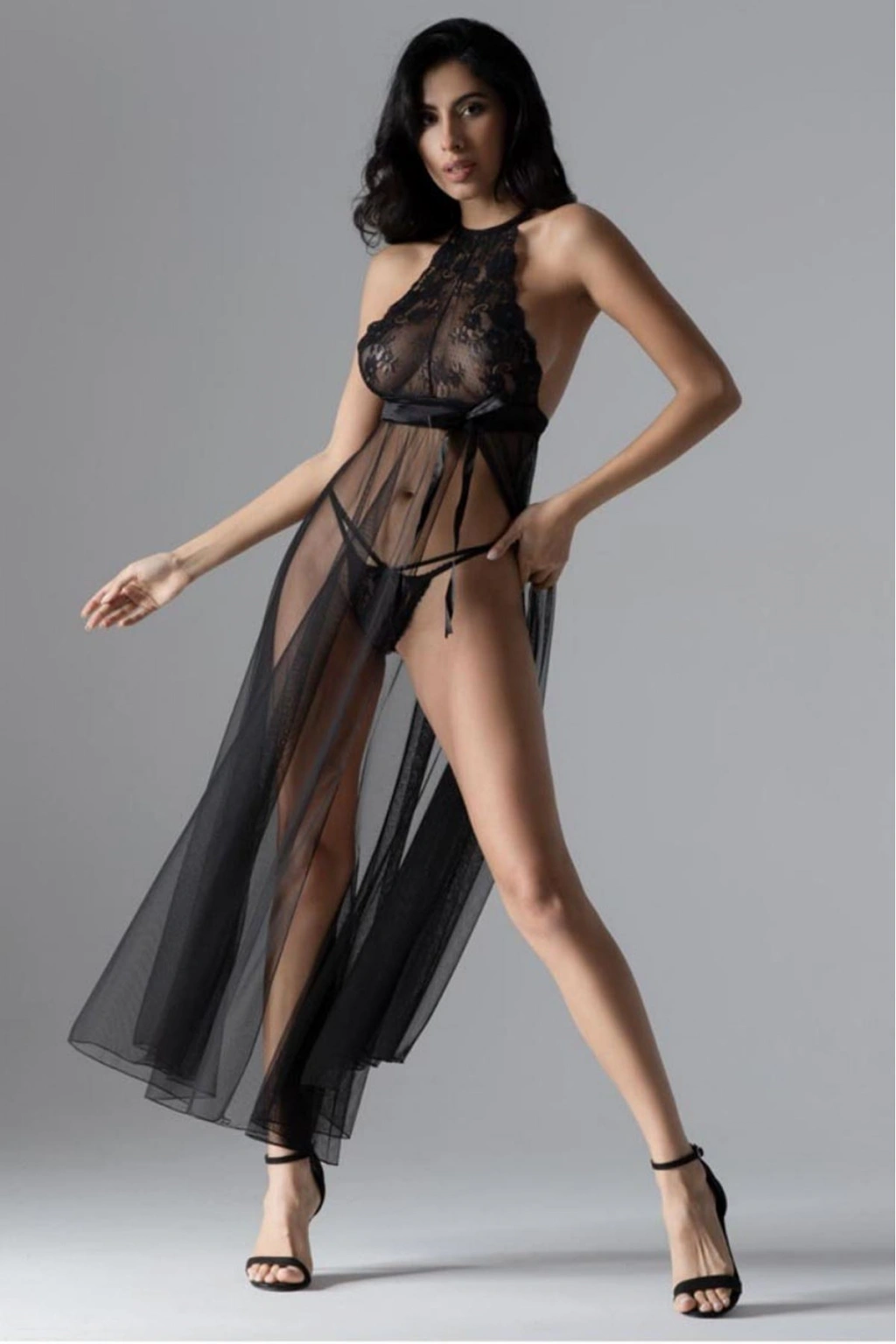Siyah Dantelli Tül Gecelik - M075