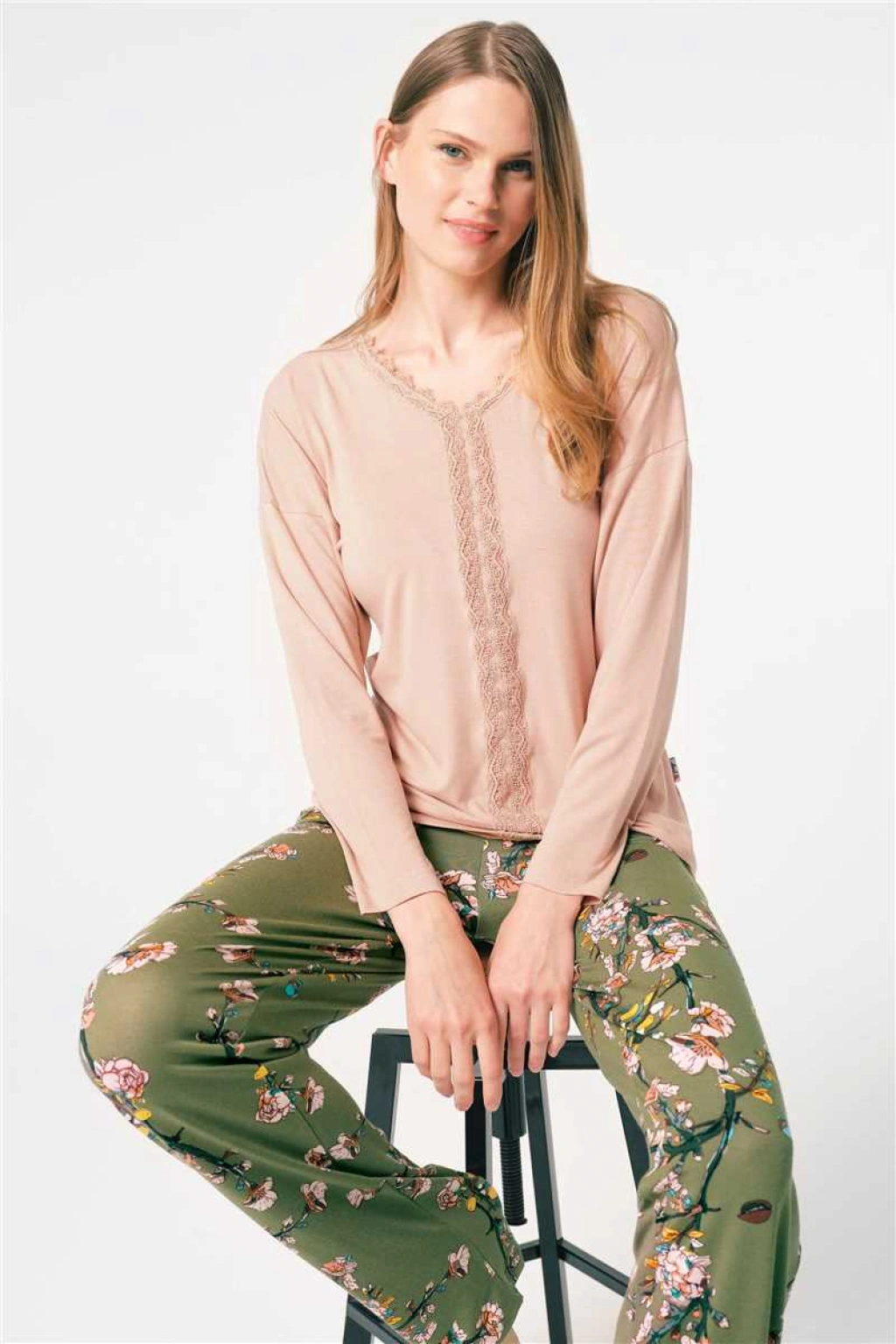 9843 Günlük Basic Ev Giyimi Uzun Kol V Yaka Viskon Çiçek Desenli Kışlık Örme Normal Bel Uzun Diz_Altı Uzun Paçalı Dantel Detaylı Pijama Takımı modelimiz