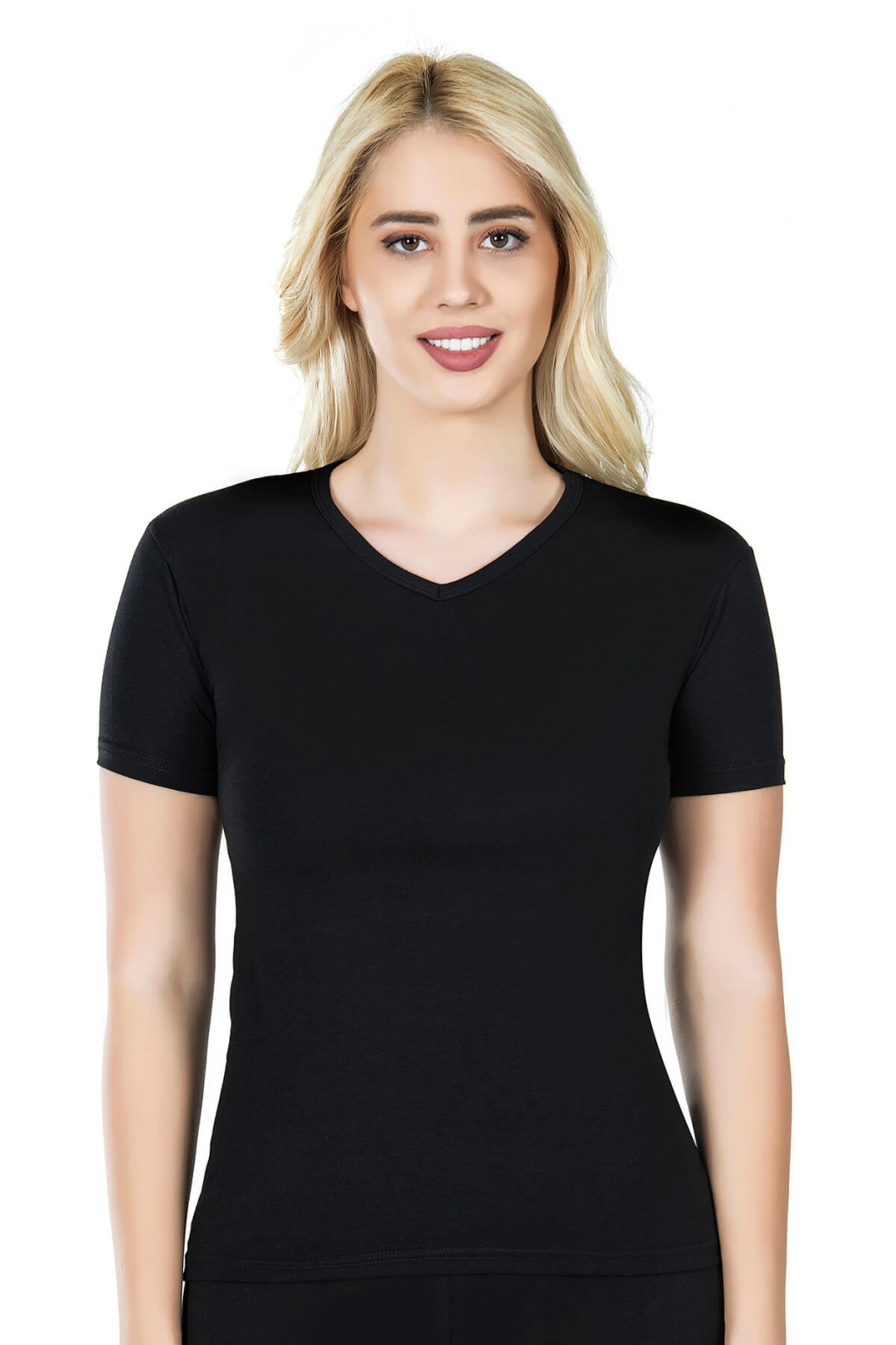 Yarım kollu, V yaka tasarıma sahip yeni sezon likralı kadın tişört modelidir.