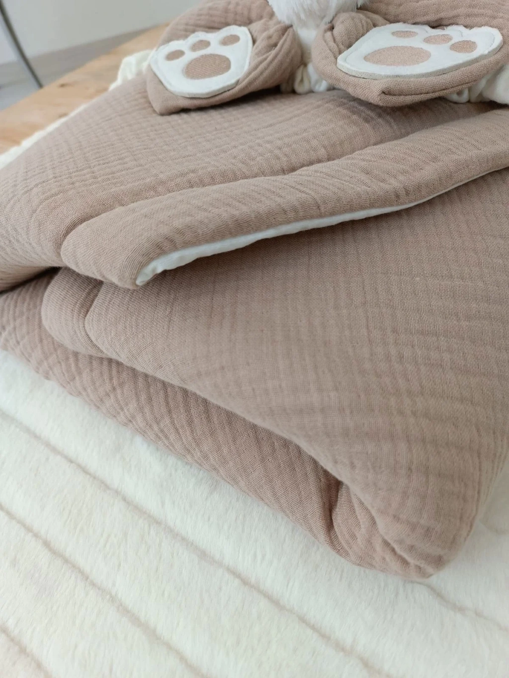 Yenidoğan 4 Kat Müslin Kumaş Kulaklı Patili Fiyonk Bebek Battaniyesi Kundak Kahverengi