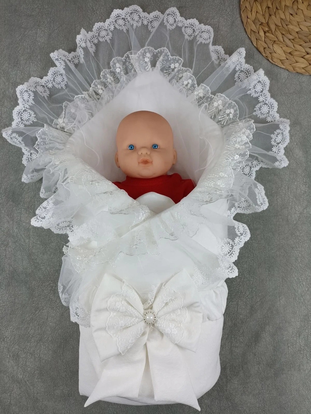 Yenidoğan Piramit Desenli Güpür İşlemeli Bebek Battaniyesi Kundak Gümüş