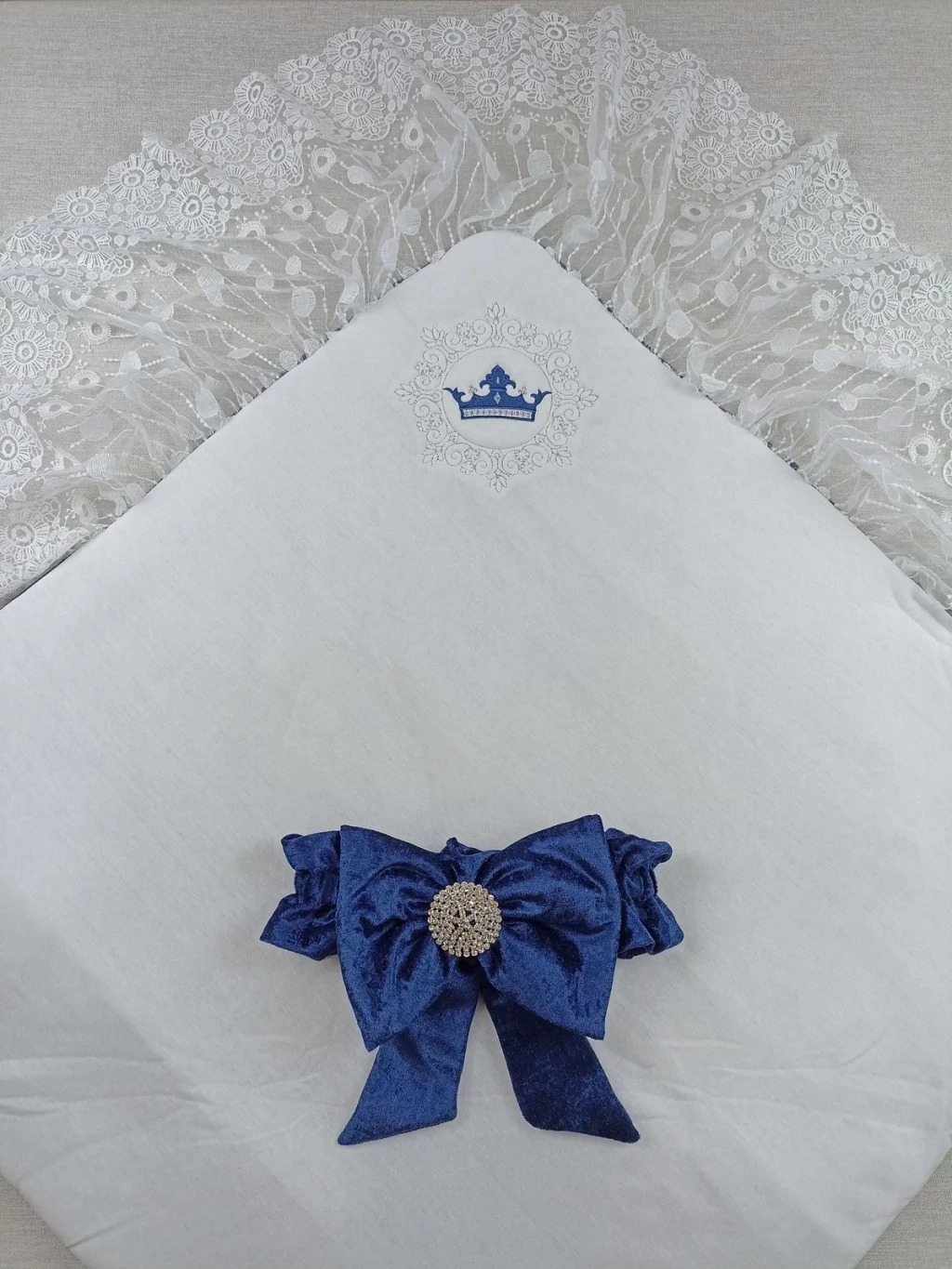Yenidoğan Saray Kadife Taç Nakışlı İnci Fiyonklu Dantel Duvak Trilüks Kundak Bebek Battaniye Lacivert